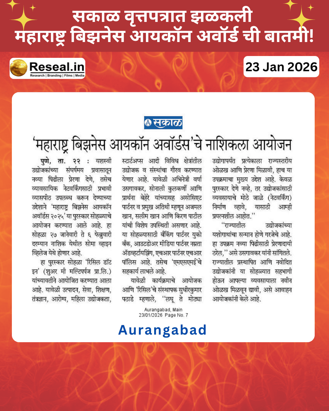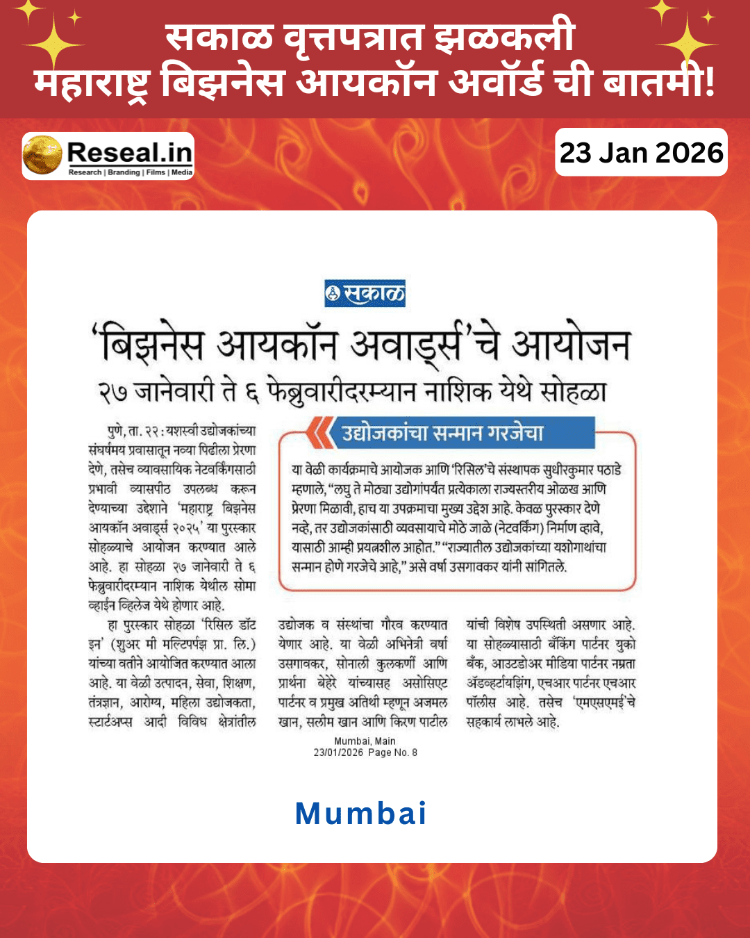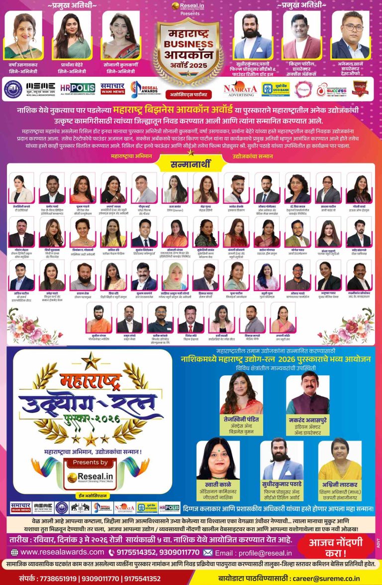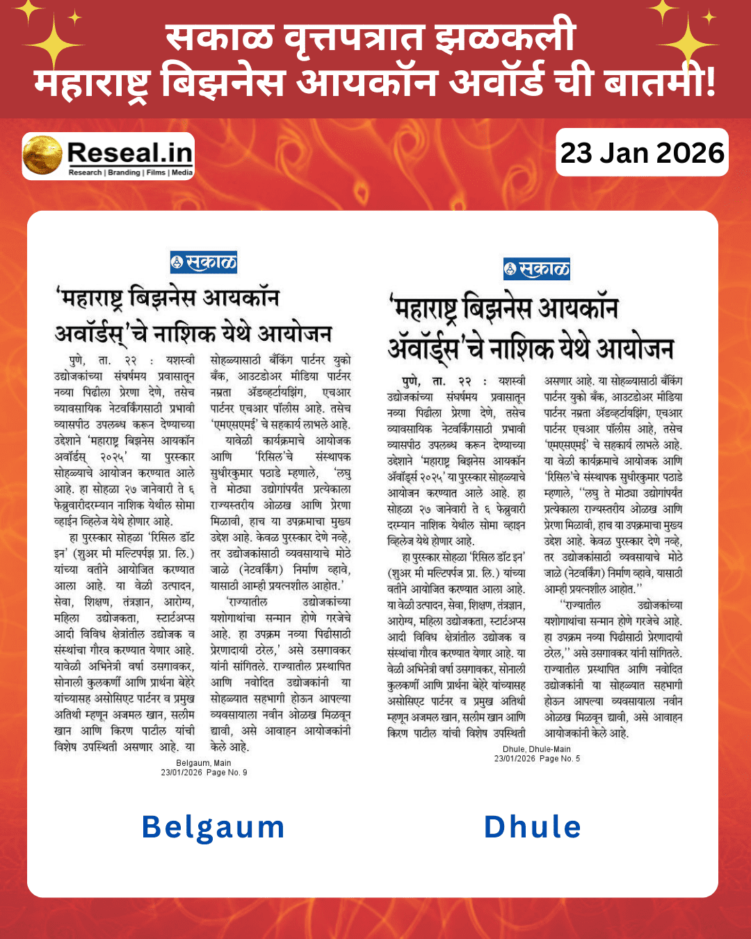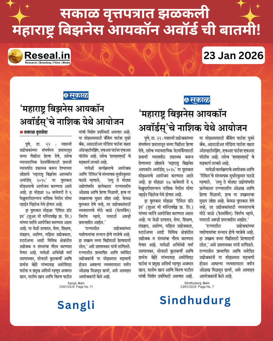 महाराष्ट्र बिझनेस आयकॉन अवॉर्ड २०२५ चे विजेते सकाळ वृत्तपत्रात झळकले! - २५ फेब्रुवारी २०२६