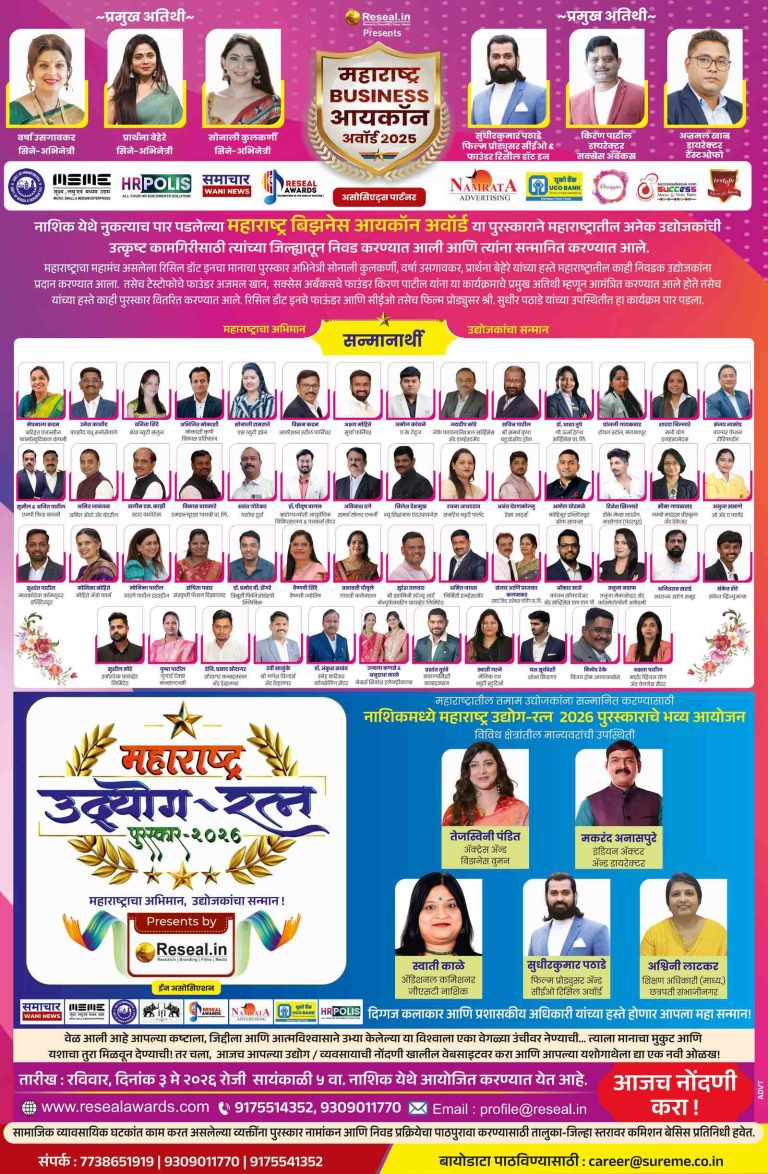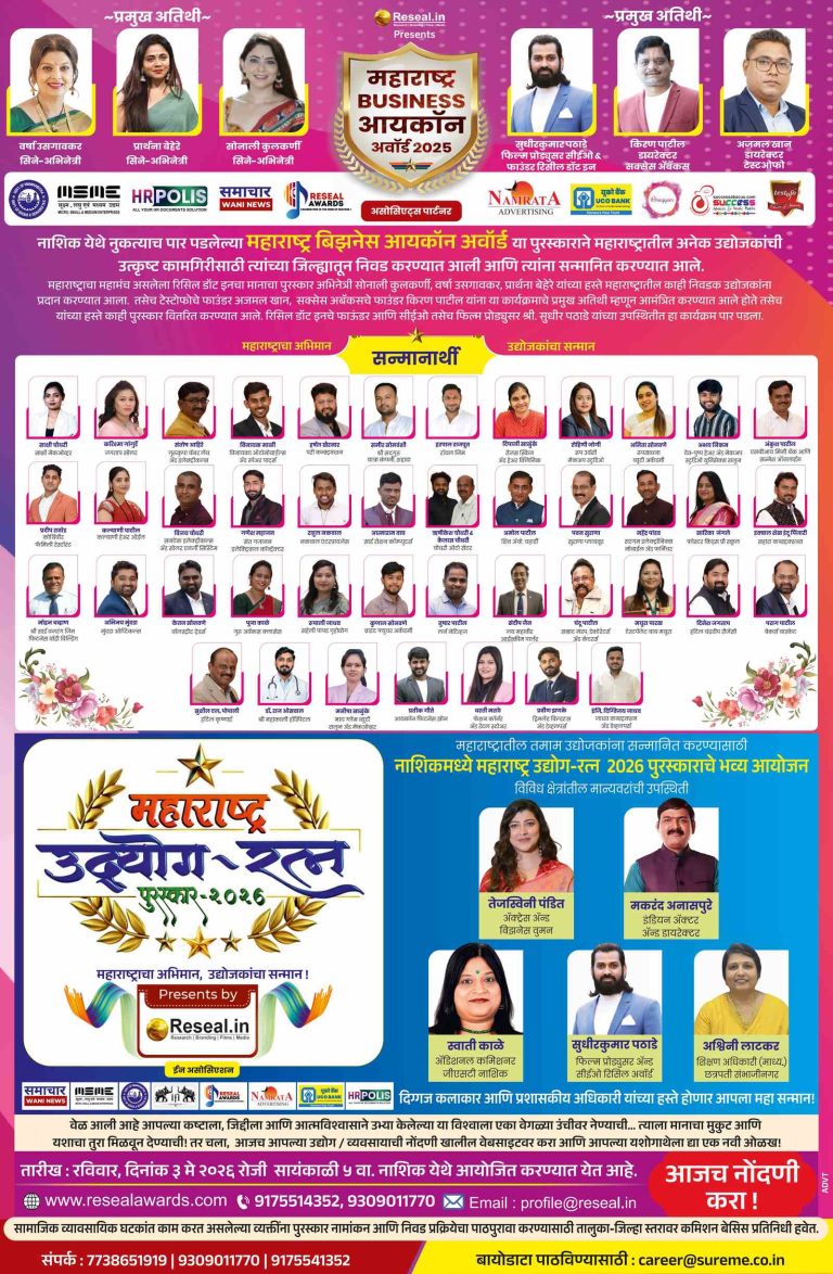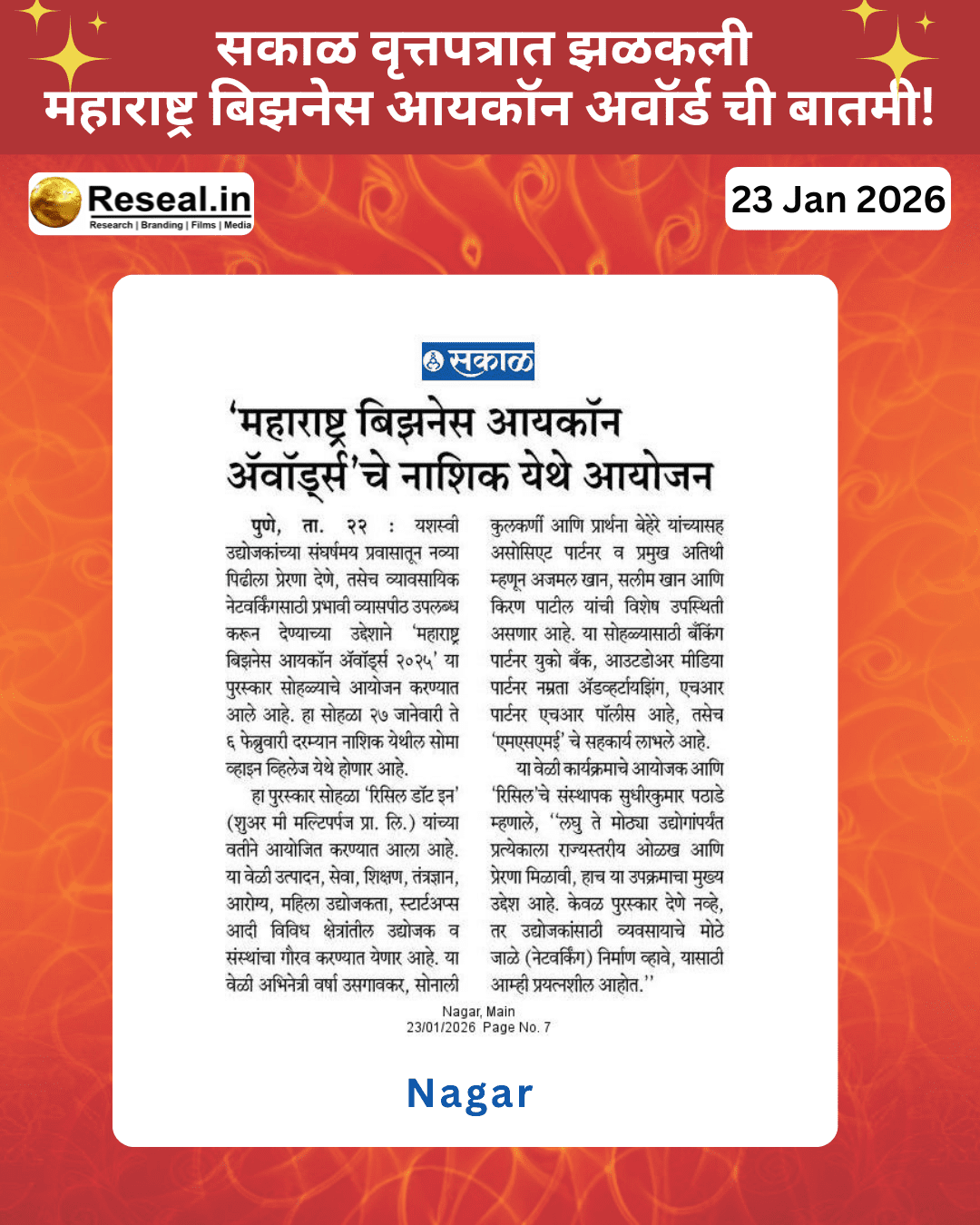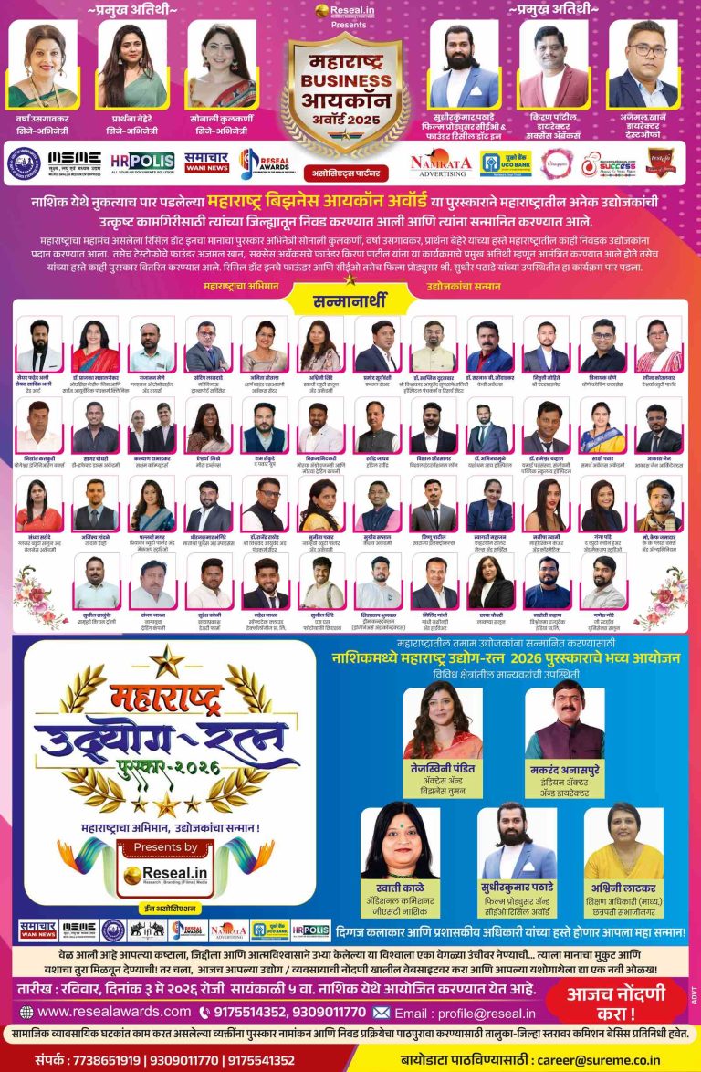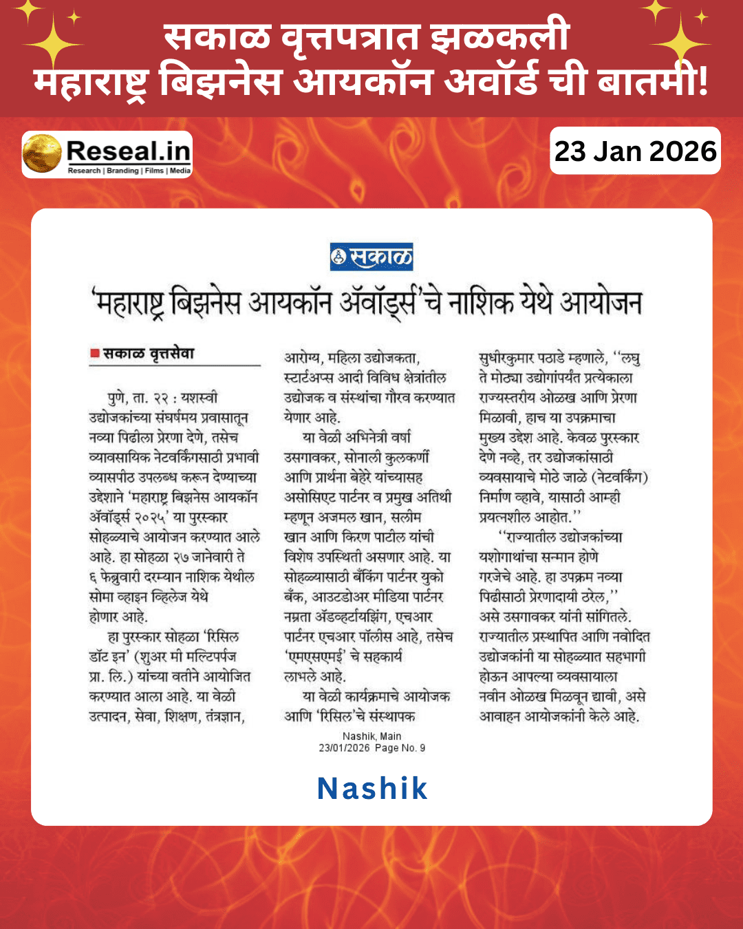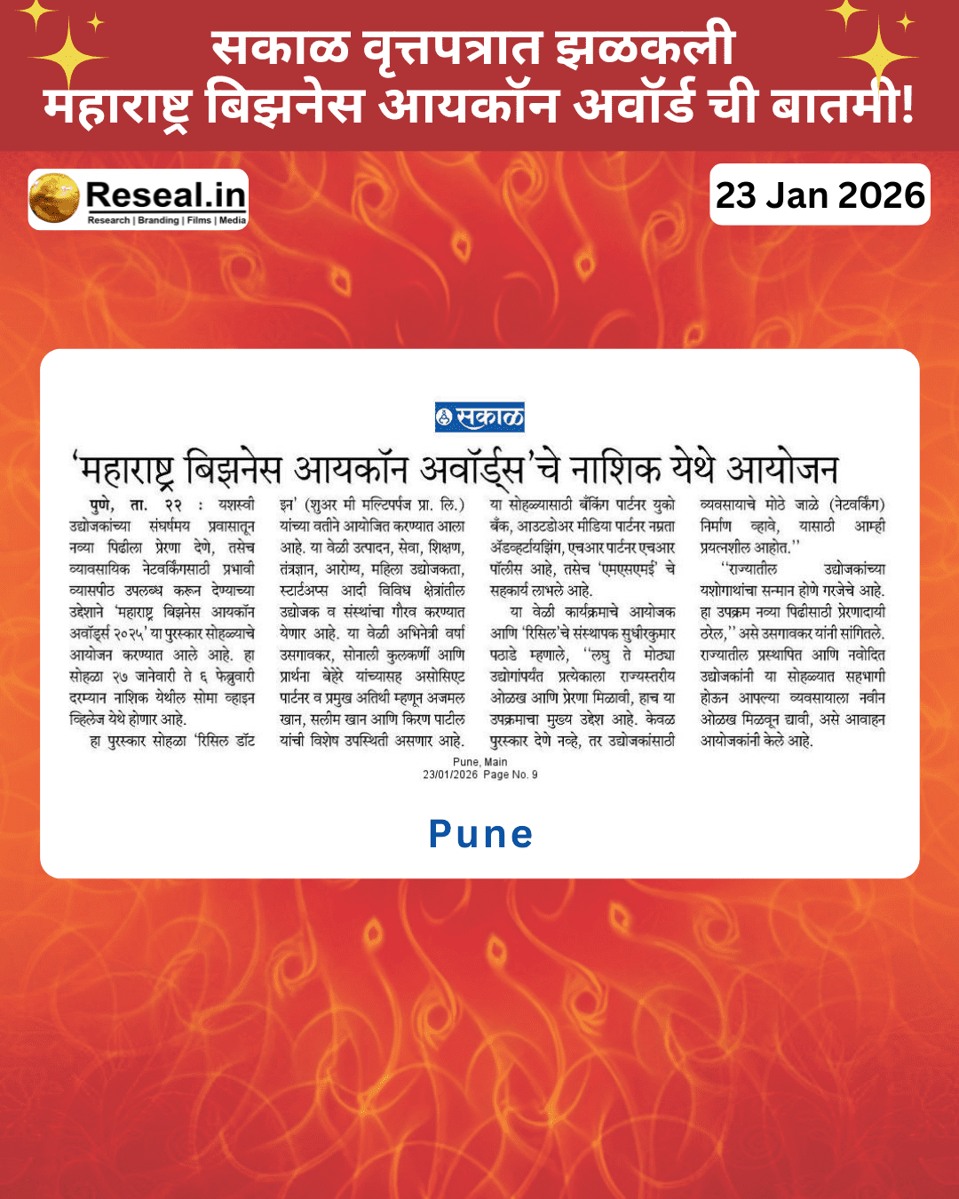 महाराष्ट्र बिझनेस आयकॉन अवॉर्ड २०२५ चे विजेते सकाळ वृत्तपत्रात झळकले! - २५ फेब्रुवारी २०२६