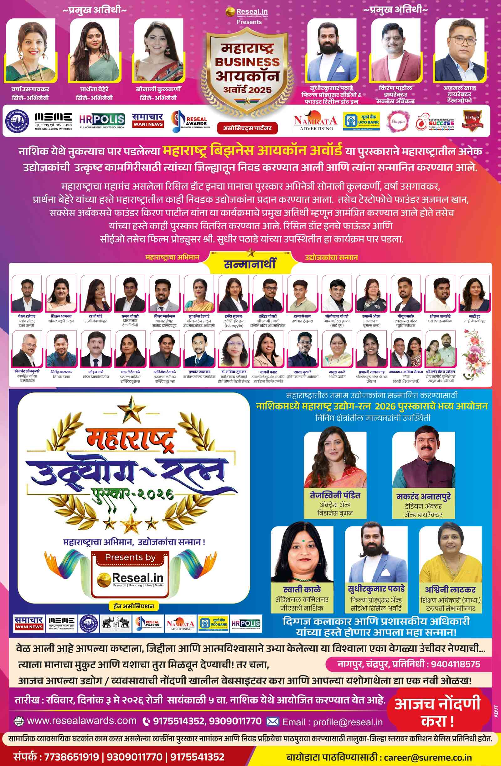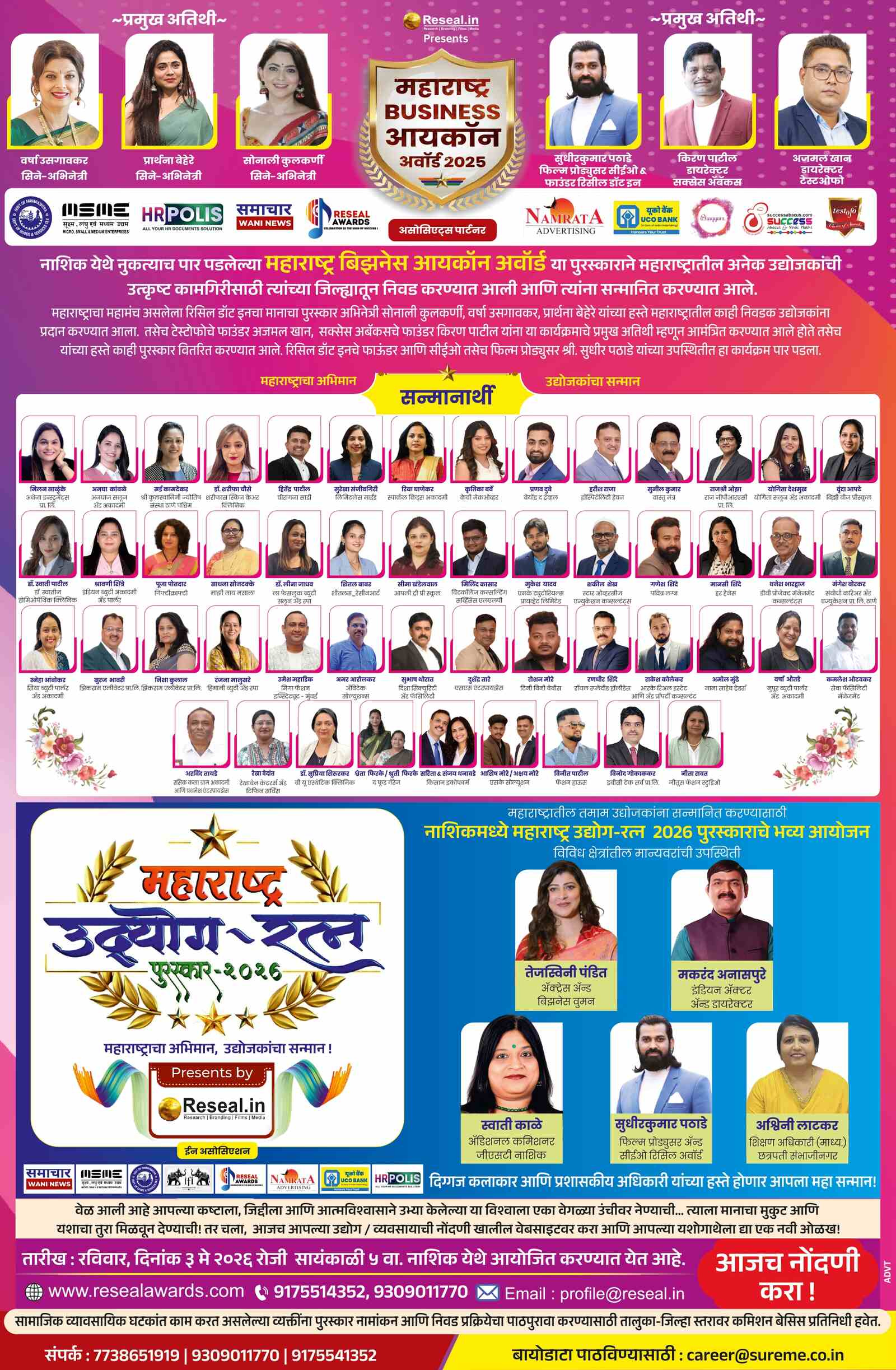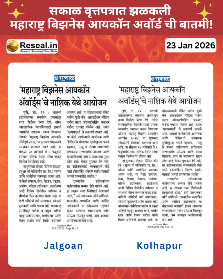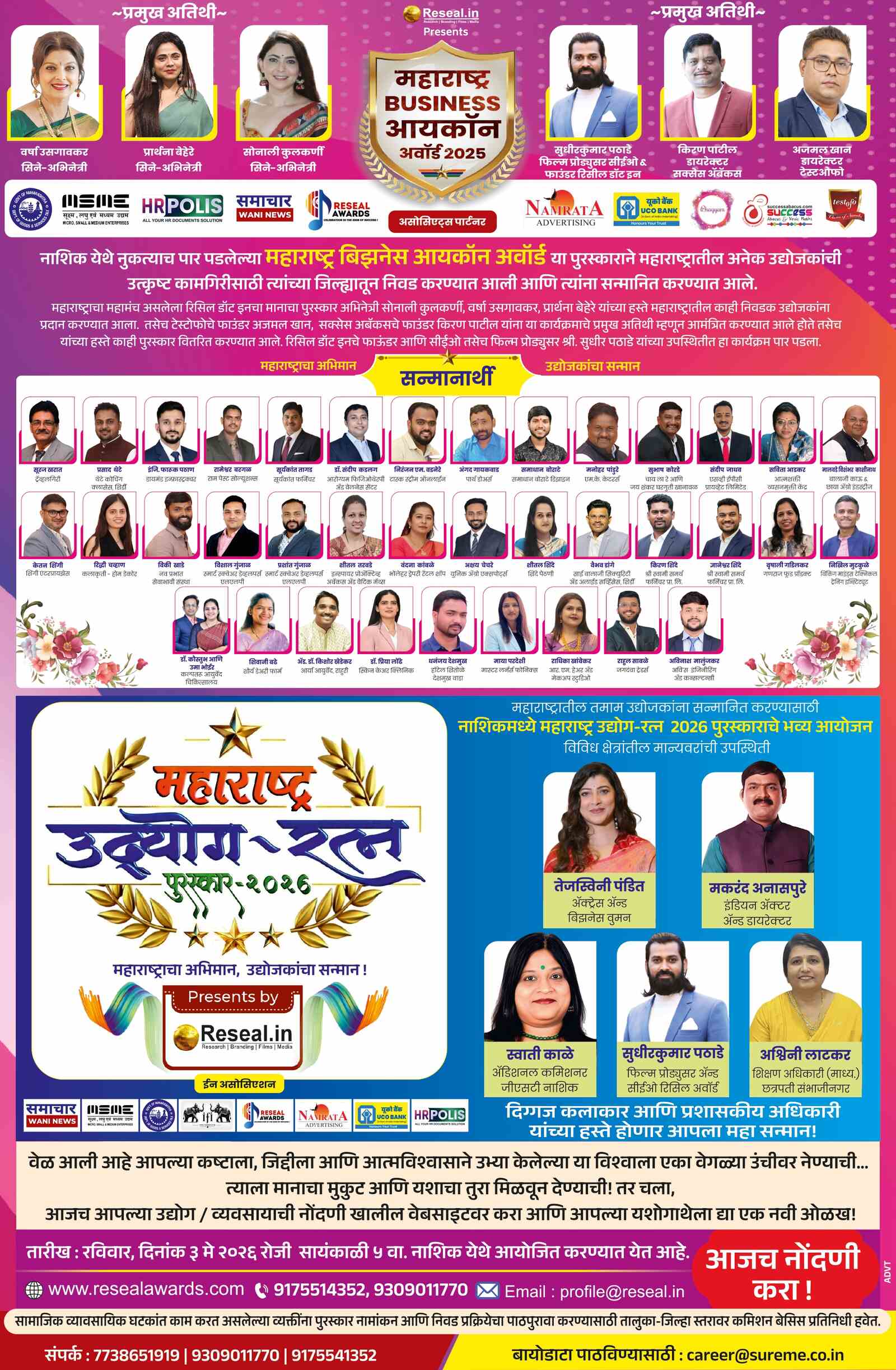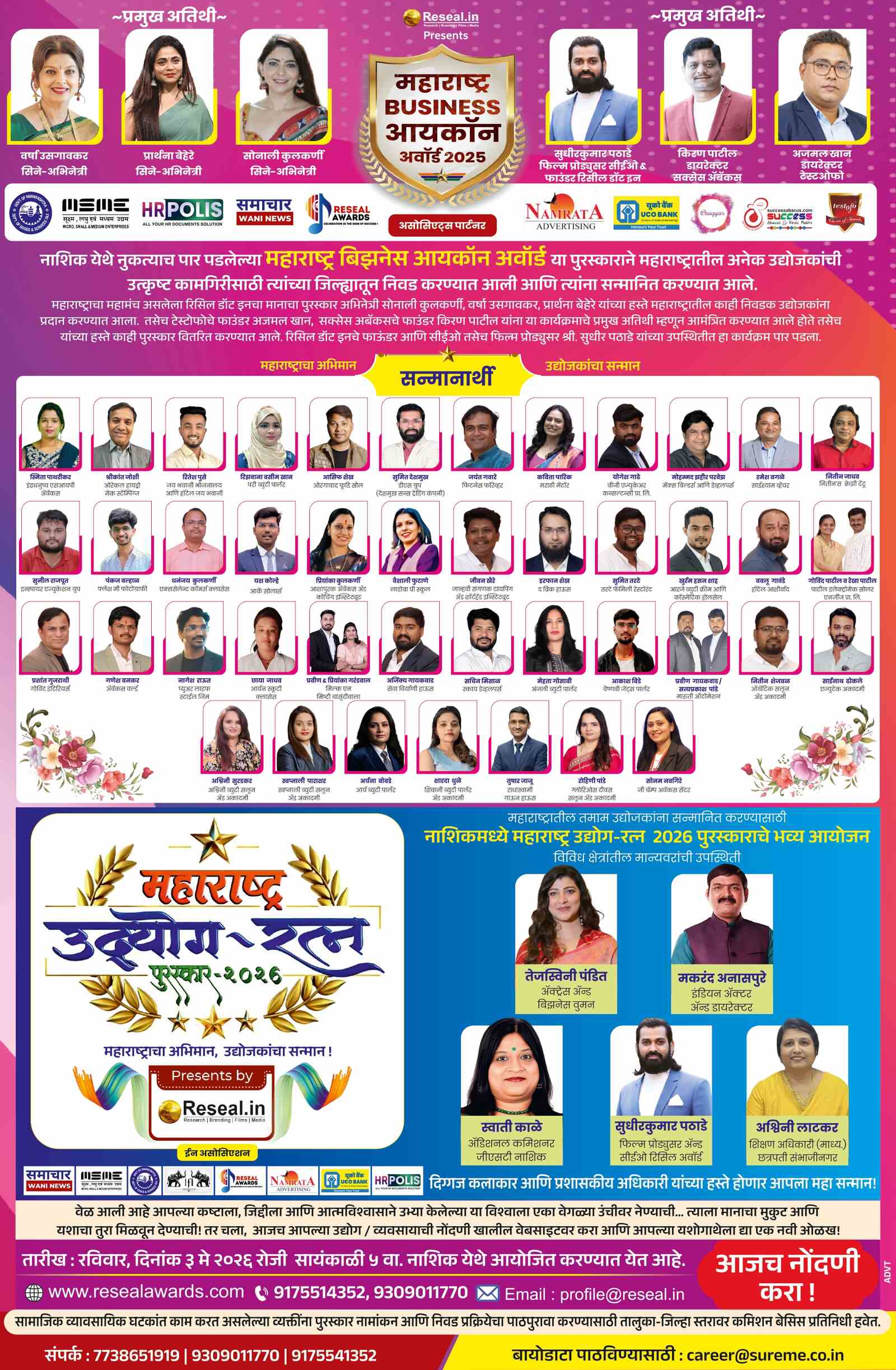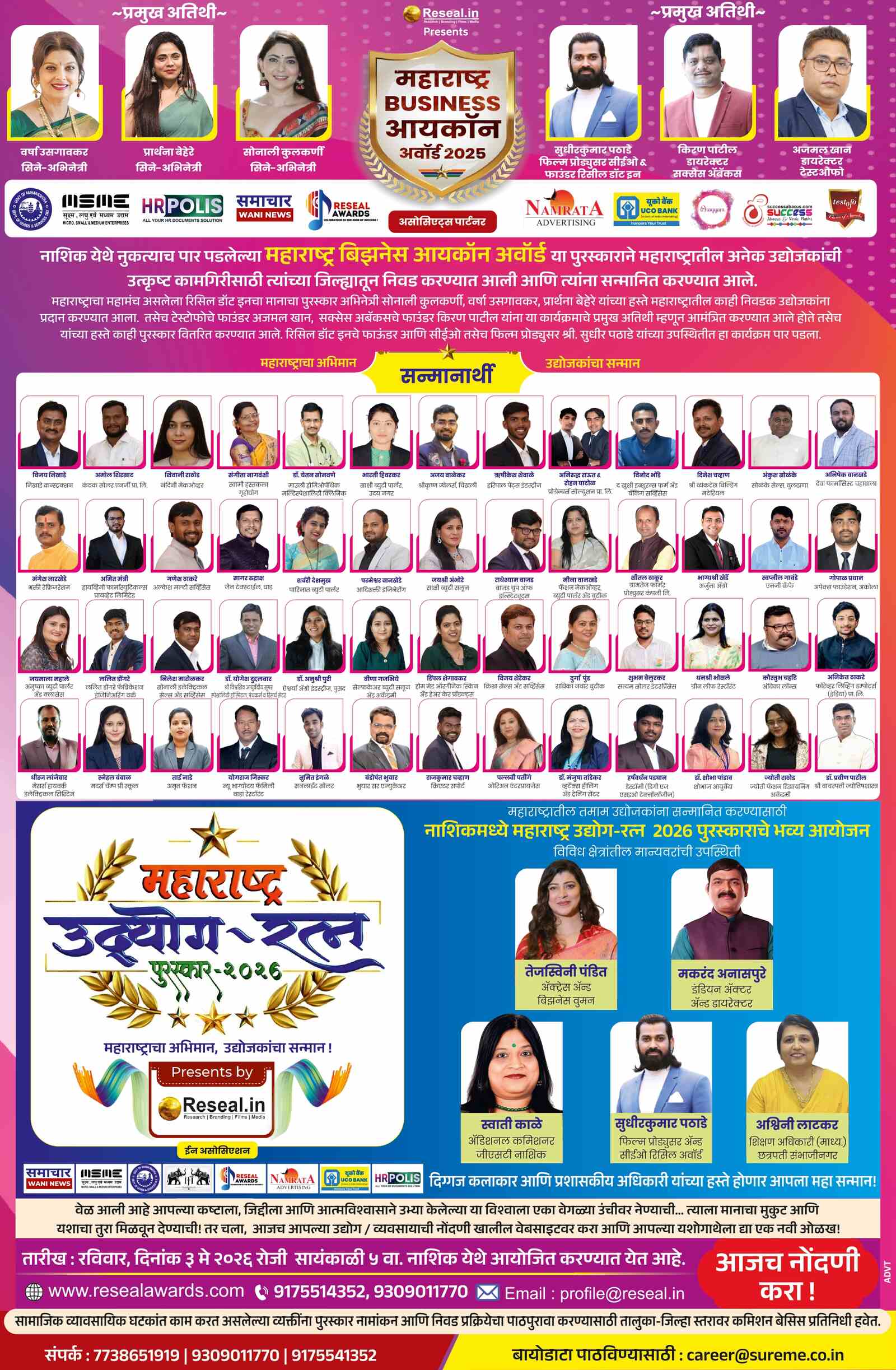 महाराष्ट्र बिझनेस आयकॉन अवॉर्ड २०२५ चे विजेते सकाळ वृत्तपत्रात झळकले! - २५ फेब्रुवारी २०२६